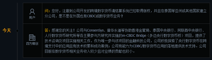 四方精創(chuàng):目前在數(shù)字貨幣相關(guān)業(yè)務(wù)收入較少且對(duì)業(yè)績(jī)的貢獻(xiàn)也較小